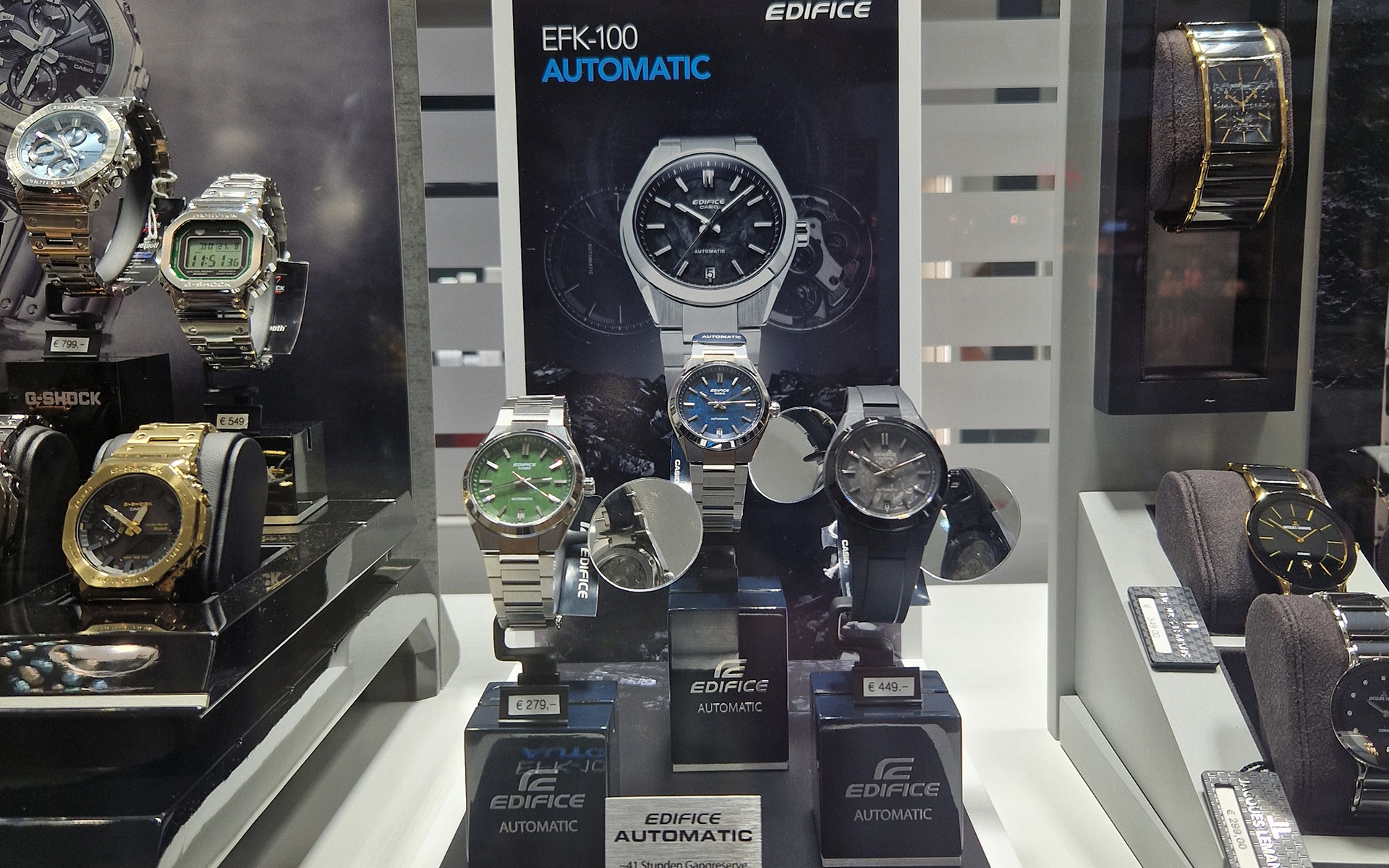 Mit seiner ersten mechanischen Uhr erweitert Casio nicht nur seine Zielgruppe, sondern ermöglicht es auch den Handelspartnern, neue Signale an die Konsumenten zu senden. Dazu gibt es besondere Präsentationsmöglichkeiten fürs Schaufenster: Cubes, die sich drehen, oder Displays mit Spiegel. Denn die Besonderheiten der neuen Edifice-Serie „EFK-100“, die mechanischen Automatikwerke, sind durch den Glasboden sichtbar.
